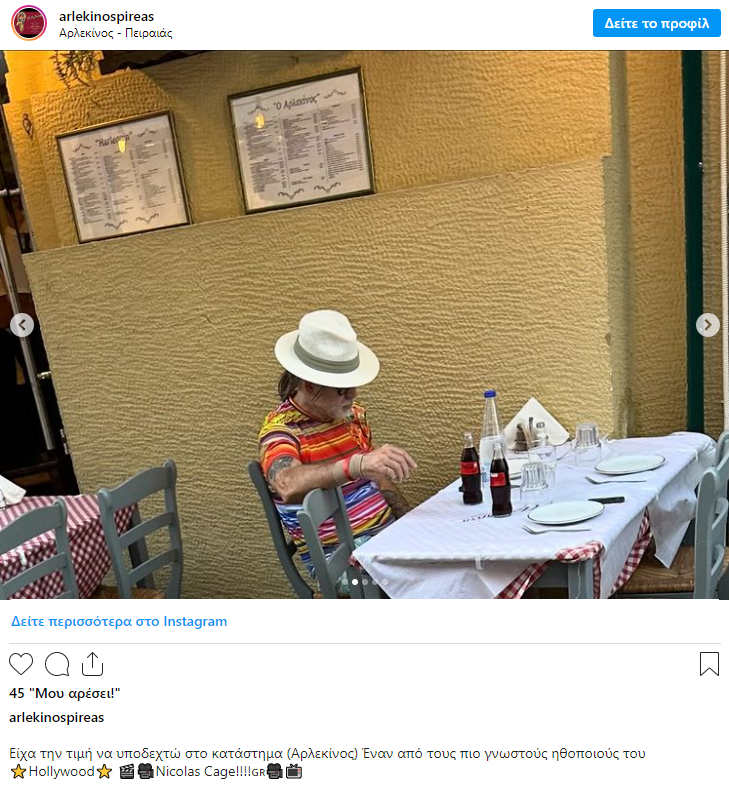 «Είχα την τιμή να υποδεχθώ στο κατάστημα (Αρλεκίνος) έναν από τους πιο γνωστούς ηθοποιούς του Χόλιγουντ, τον Nicolas Cage!!!», έγραψε στη λεζάντα της ανάρτησής του ο Κώστας Κεφαλάς, ιδιοκτήτης του γνωστού μαγαζιού, δημοσιεύοντας σειρά από σχετικά στιγμιότυπα.