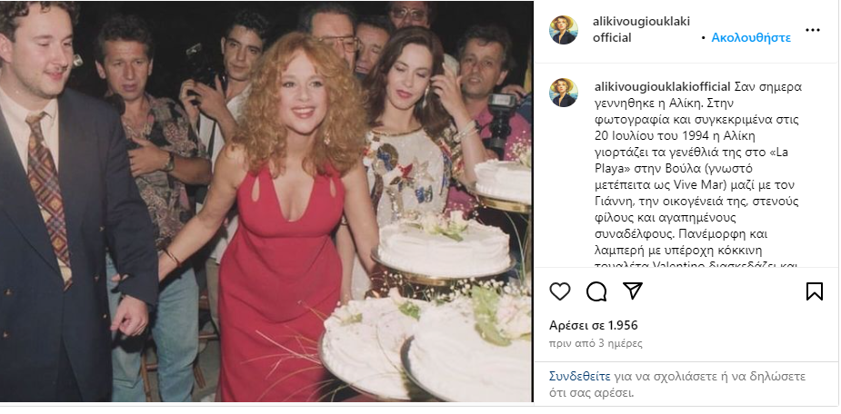 Ο Γιάννης έγραψε: «Σαν σήμερα γεννήθηκε η Αλίκη. Στην φωτογραφία, η Αλίκη γιορτάζει τα γενέθλιά της φορώντας μια υπέροχη κόκκινη τουαλέτα Valentino, διασκεδάζοντας και χορεύοντας όλη τη νύχτα, απολαμβάνοντας τις ευχές των καλεσμένων.