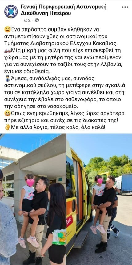 Σύμφωνα με ανακοίνωση της Γενικής Περιφερειακής Αστυνομικής Διεύθυνσης Ηπείρου, η ανήλικη, που επισκεπτόταν την Ελλάδα με τη μητέρα της, έχασε τις αισθήσεις της ενόσω περίμεναν να συνεχίσουν το ταξίδι τους. Άμεσα, αστυνομικός συνοδός υπηρεσιακού σκύλου μετέφερε την κοπέλα στην αγκαλιά του σε κατάλληλο σημείο για τις πρώτες βοήθειες και στη συνέχεια τη συνόδευσε μέχρι το ασθενοφόρο που την παρέλαβε και τη μετέφερε σε νοσοκομείο της περιοχής.