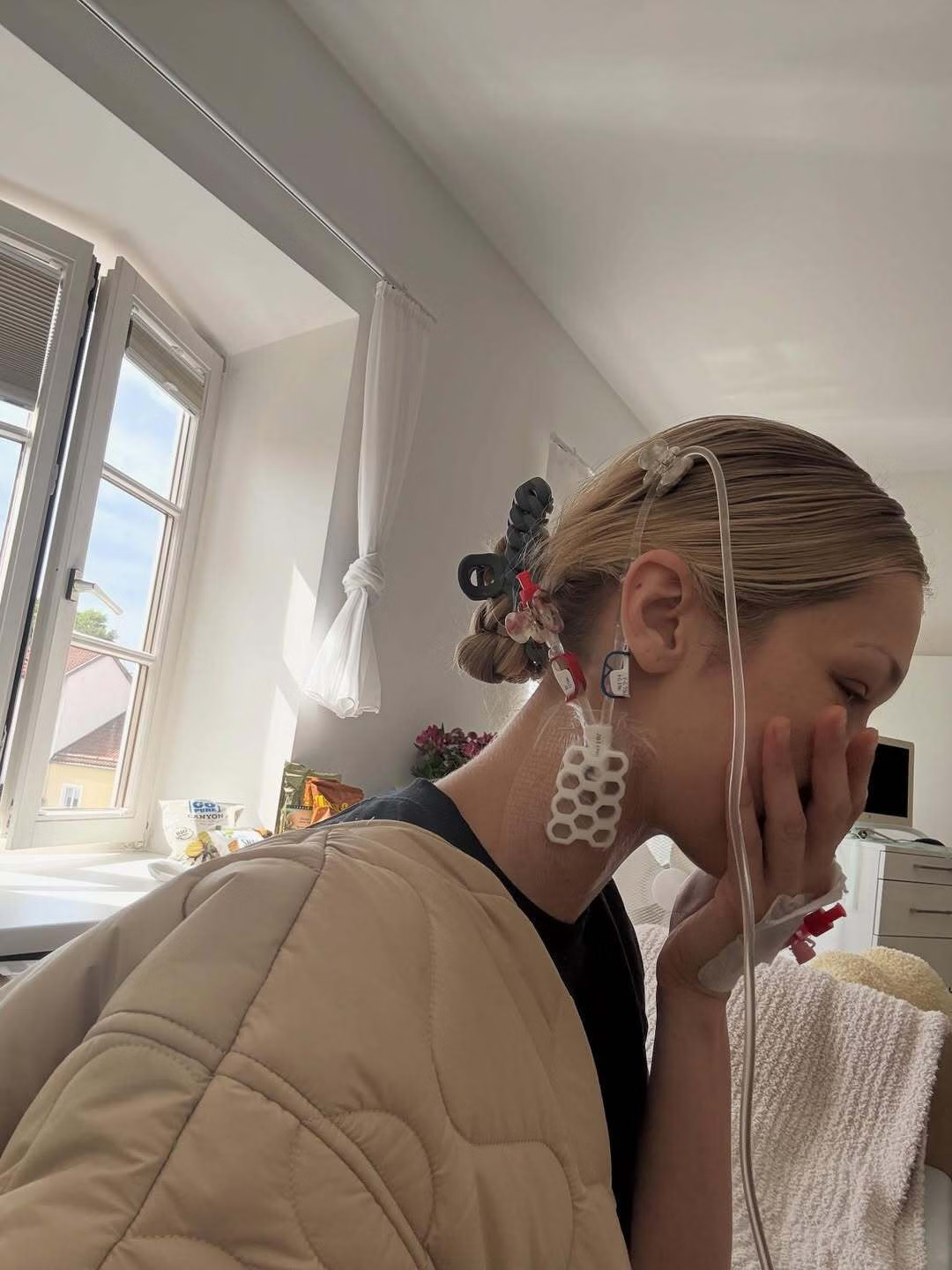 Σε αρκετές φωτογραφίες που κοινοποιήθηκαν μέσω Instagram, η 28χρονη φαίνεται ξαπλωμένη σε ένα κρεβάτι με ορό. Κατακόκκινη, με πρησμένο πρόσωπο και εμφανώς εξαντλημένη η νεαρή γυναίκα δείχνει να δίνει μια δύσκολη μάχη.