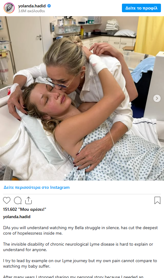 Η Γιολάντα Χαντίντ δημοσίευσε φωτογραφίες της κόρης της στο νοσοκομείο, περιγράφοντας μέσα από ανάρτησή της στο Instagram τη «σιωπηλή μάχη» της Μπέλα με την ασθένεια, που όπως τόνισε «έχει ραγίσει τον πυρήνα της ύπαρξής της».