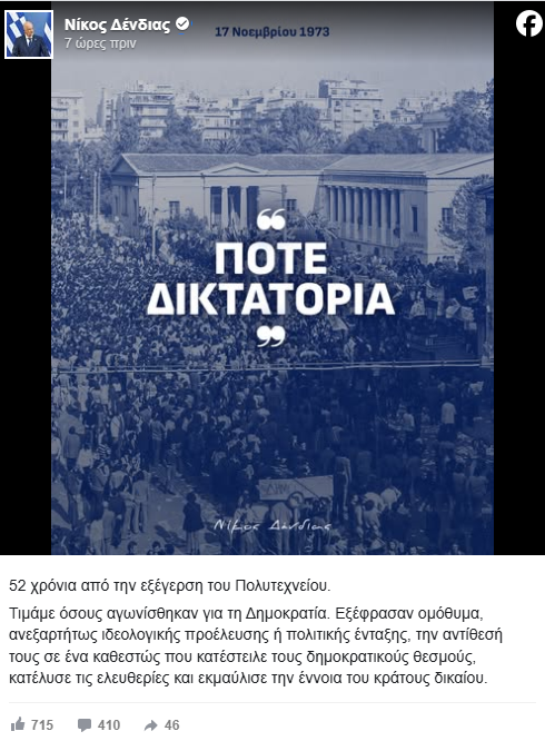 Ο υπουργός Εθνικής Άμυνας, Νίκος Δένδιας, με αφορμή τη συμπλήρωση 52 χρόνων από την εξέγερση του Πολυτεχνείου, ανέφερε σε ανάρτησή του στην πλατφόρμα Χ: «Τιμάμε όσους αγωνίσθηκαν για τη Δημοκρατία. Εξέφρασαν ομόθυμα, ανεξαρτήτως ιδεολογικής προέλευσης ή πολιτικής ένταξης, την αντίθεσή τους σε ένα καθεστώς που κατέστειλε τους δημοκρατικούς θεσμούς, κατέλυσε τις ελευθερίες και εκμαύλισε την έννοια του κράτους δικαίου».