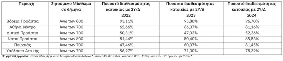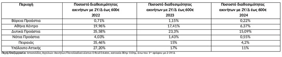 Τα διαθέσιμα προς μίσθωση ακίνητα (80-110τμ, άνω του 1ου ορόφου) με ζητούμενο μίσθωμα έως 600 € σύμφωνα με τις αναρτημένες αγγελίες σε ιστοσελίδες στις περιοχές της Αθήνας, αποτελούν το 6,37% (17,41% το 2023 και 19,96% το2022) του συνόλου των προς μίσθωση κατοικιών, στα Βόρεια Προάστια μόλις το 0,22% (1,15% το 2023 και 0,71% το 2022), στα Νότια Προάστια το 0,55% (1,43% το 2023, 4,03% το 2022), στα Δυτικά Προάστια το 15,09% (23,3% το 2023, 35,58% το 2022), στο Υπόλοιπο Αττικής το 11% (17% το 2023, 27,20% το 2022) και στον Πειραιά το 4,2% (15% το 2023, 35,46% το 2022).