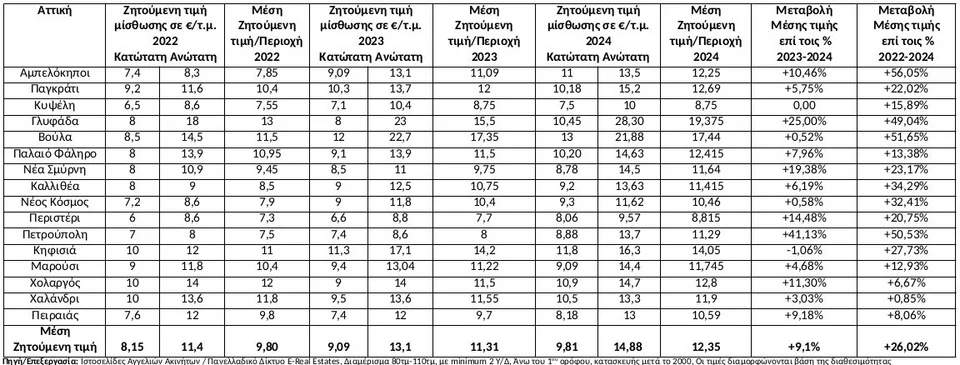 Με βάση τα στοιχεία που προκύπτουν από τις διαθέσιμες αγγελίες ακινήτων σε περιοχές της Αθήνας με τη μεγαλύτερη ζήτηση από οικογένειες για ενοικίαση κατοικίας, η μέση ζητούμενη τιμή μίσθωσης κυμαίνεται στα 12,35€/τ.μ. ( 11,31€/τ.μ. το 2023, 9,8 €/τ.μ. το 2022) για διαμέρισμα 80τμ-110τμ άνω του 1ου ορόφου, κατασκευής μετά το 2000.