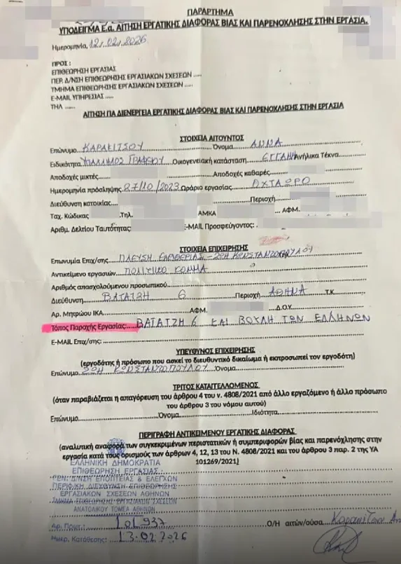 Η ίδια υπέβαλε επίσημη αναφορά στην Επιθεώρηση Εργασίας, ζητώντας τη λύση της σύμβασής της. Όπως αναφέρεται, είχε προσληφθεί με σύμβαση αορίστου χρόνου στις 27 Οκτωβρίου 2023, ενώ πλέον έχει προχωρήσει σε καταγγελία της σύμβασης και διεκδικεί τις οφειλόμενες αποδοχές της μέσω της αρμόδιας υπηρεσίας.