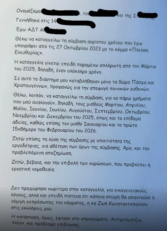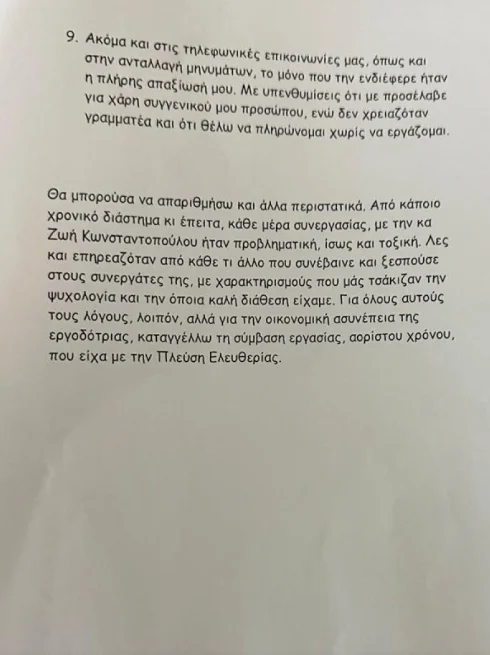 Θα μπορούσα να απαριθμήσω και άλλα περιστατικά. Από κάποιο χρονικό διάστημα κι έπειτα, κάθε μέρα συνεργασίας, με την κα Ζωή Κωνσταντοπούλου ήταν προβληματική, ίσως και τοξική. Λες και επηρεαζόταν από κάθε τι άλλο που συνέβαινε και ξεσπούσε στους συνεργάτες της, με χαρακτηρισμούς που μάς τάραζαν την ψυχολογία και την όποια καλή διάθεση είχαμε. Για όλους αυτούς τους λόγους, λοιπόν, αλλά για την οικονομική ασυνέπεια της εργοδότριας, καταγγέλλω τη σύμβαση εργασίας, αορίστου χρόνου, που είχα με την Πλεύση Ελευθερίας».