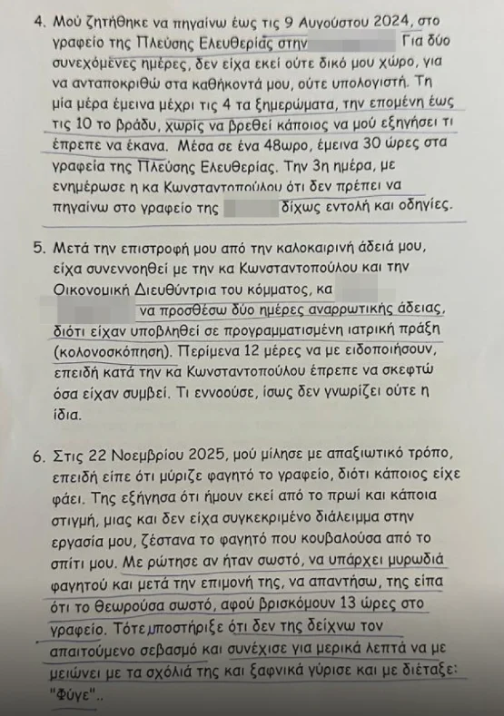 «Στη διάρκεια της σύμβασης εργασίας αορίστου χρόνου που με συνδέει με την Πλεύση Ελευθερίας υπήρξαν πλείστα περιστατικά απαξίωσης μου από την κα Ζωή Κωνσταντοπούλου. Ξεπέρασαν και τα όρια του bullying, που με οδήγησαν να ζητήσω ακόμα και τη βοήθεια ψυχολόγου, για να σταθώ στα πόδια μου και να διατηρήσω την ψυχραιμία μου, αλλά κυρίως για να παραμείνω συνεπής στις δραστηριότητές μου ως μητέρα και σύζυγος. Ο καθένας, άλλωστε, γνωρίζει ότι στις περισσότερες περιπτώσεις η τοξικότητα στο εργασιακό περιβάλλον επηρεάζει την προσωπική ζωή των εργαζομένων και διαταράσσει την οικογενειακή γαλήνη τους. Καταγράφω κάποιες από τις εντολές που έκαναν εξαιρετικά δυσχερή την άσκηση των καθηκόντων μου και επίσης περιστατικά που με έφθειραν ψυχικά και σωματικά.