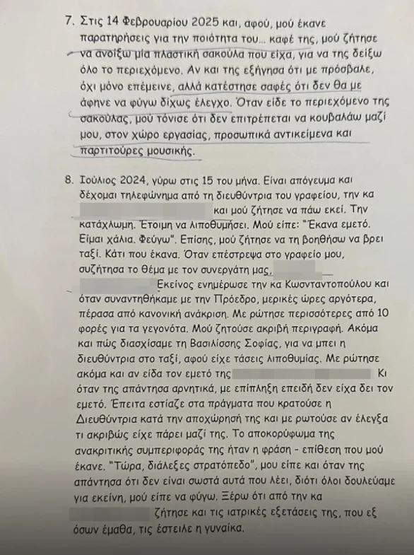 7.Στις 14 Φεβρουαρίου 2025 και, αφού, μού έκανε παρατηρήσεις για την ποιότητα του… καφέ της, μού ζήτησε να ανοίξω μία πλαστική σακούλα που είχα, για να της δείξω όλο το περιεχόμενο. Αν και της εξήγησα ότι με προσβάλλει, όχι μόνο επέμεινε, αλλά κατέστησε σαφές ότι δεν θα με άφηνε να φύγω δίχως έλεγχο. Όταν είδε το περιεχόμενο της σακούλας, μού τόνισε ότι δεν επιτρέπεται να κουβαλάω μαζί μου, στον χώρο εργασίας, προσωπικά αντικείμενα και παρτιτούρες μουσικής.