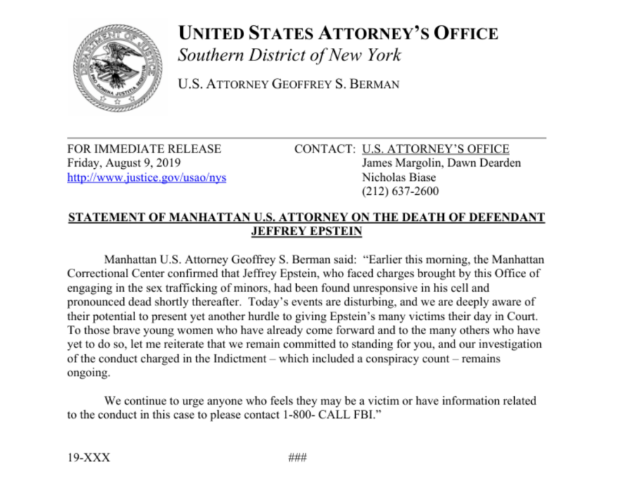 Στην εισαγγελική ανακοίνωση που ήρθε στην επιφάνεια, ο τότε ομοσπονδιακός εισαγγελέας του Μανχάταν, Τζέφρι Σ. Μπέρμαν, ανέφερε: «Νωρίτερα σήμερα το πρωί, το Ομοσπονδιακό Κέντρο Κράτησης του Μανχάταν επιβεβαίωσε ότι ο Τζέφρι Επστάιν, ο οποίος αντιμετώπιζε κατηγορίες που είχαν ασκηθεί από το Γραφείο μας για εμπλοκή σε σεξουαλική εμπορία ανηλίκων, βρέθηκε αναίσθητος στο κελί του και λίγο αργότερα διαπιστώθηκε ο θάνατός του. Τα σημερινά γεγονότα είναι ανησυχητικά και έχουμε πλήρη επίγνωση του ενδεχομένου να αποτελέσουν ακόμη ένα εμπόδιο στο να δοθεί στα πολυάριθμα θύματα του Επστάιν η δυνατότητα να μιλήσουν στο δικαστήριο. Στις γενναίες νεαρές γυναίκες που έχουν ήδη μιλήσει και στις πολλές άλλες που δεν το έχουν ακόμη πράξει, θέλω να επαναλάβω ότι παραμένουμε δεσμευμένοι να σταθούμε στο πλευρό σας και να συνεχίσουμε την έρευνά μας για τις πράξεις που περιγράφονται στο κατηγορητήριο».