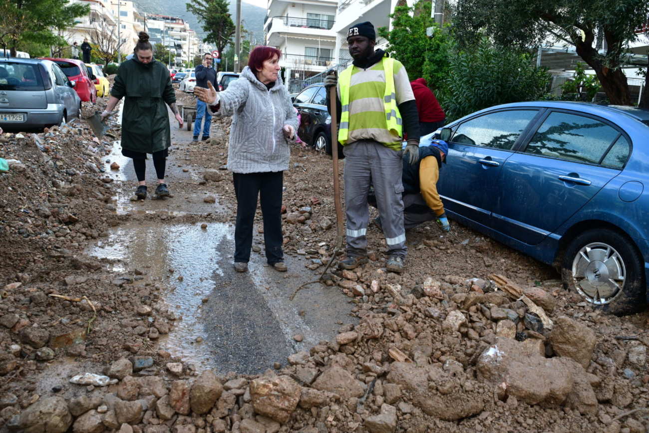 Κάτοικοι και συνεργεία του δήμου από το νωρίς το πρωί άρχισαν το δύσκολο έργο του καθαρισμόυ που δεν είναι εύκολο να ολοκληρωθεί άμεσα ενώ υπάρχει ο κίνδυνος και νέων βροχοπτώσεων σήμερα.