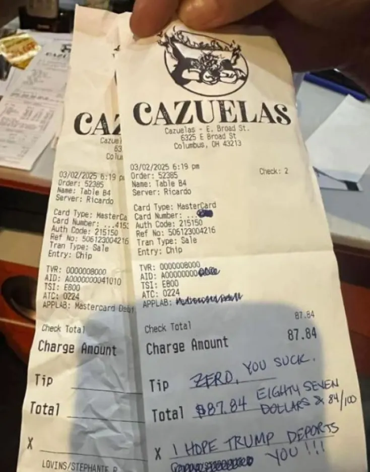 Το περιστατικό συνέβη στο Cazuelas Mexican Restaurant & Cantina, όπου η Στέφανι Λόβινς, αντί να αφήσει φιλοδώρημα στον λογαριασμό των 87,84 δολαρίων, έγραψε: «Ελπίζω ο Τραμπ να σε απελάσει» και «Είσαι μηδενικό, είσαι άθλιος».