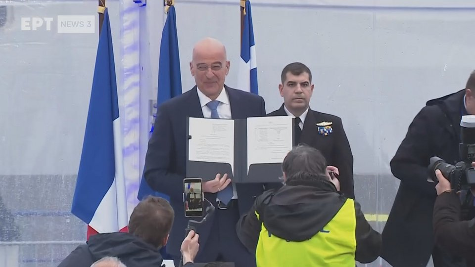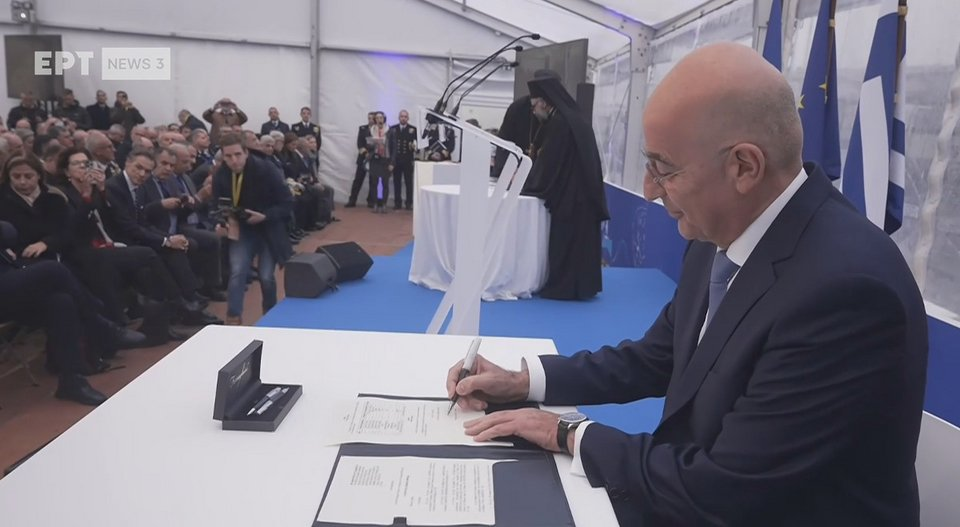 Λίγο μετά τον αγιασμό, ο Νίκος Δένδιας υπέγραψε την ένταξη της φρεγάτας «Κίμων» στις ελληνικές Ένοπλες Δυνάμεις: