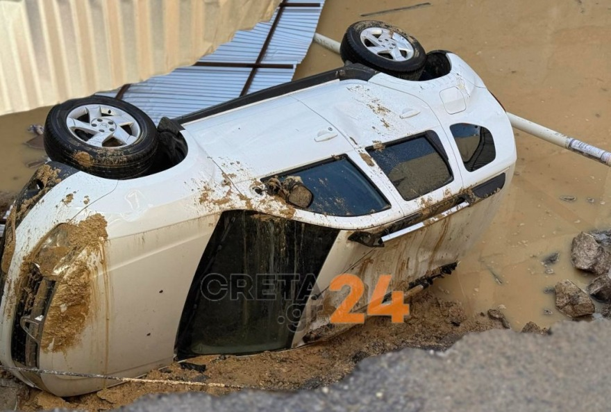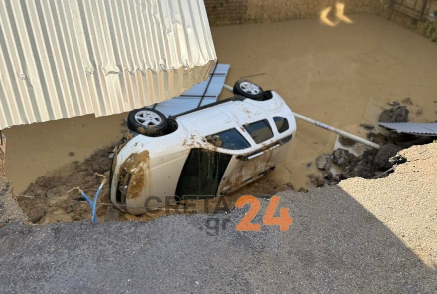 Ένα αυτοκίνητο μάλιστα «βούλιαξε» όταν υποχώρησε το οδόστρωμα στην οδό Φωτάκη, κάθετη της λεωφόρου Δημοκρατίας, στο κέντρο του Ηρακλείου. Το σταθμευμένο όχημα καρφώθηκε αρχικά μέσα στη λακκούβα που δημιουργήθηκε και έπειτα κατέρρευσε πλήρως.