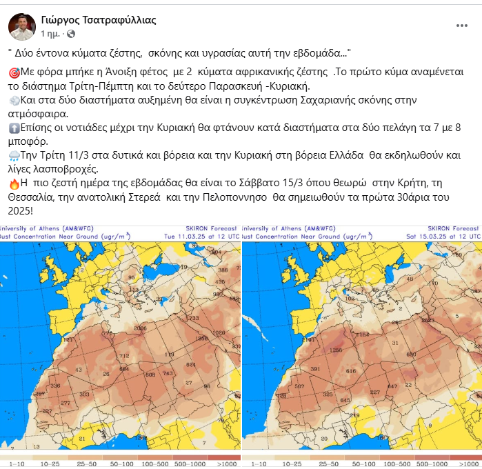 Η πιο ζεστή ημέρα της εβδομάδας θα είναι το Σάββατο 15/3 όπου θεωρώ στην Κρήτη, τη Θεσσαλία, την ανατολική Στερεά και την Πελοποννησο θα σημειωθούν τα πρώτα 30άρια του 2025!»