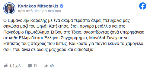«Ο Εμμανουήλ Καραλής με ένα ακόμα τεράστιο άλμα, πέτυχε να μας σηκώσει μαζί του ψηλά! Κατέκτησε, έτσι, αργυρό μετάλλιο και στο Παγκόσμιο Πρωτάθλημα Στίβου στο Τόκιο, σκορπίζοντας ξανά υπερηφάνεια σε κάθε Ελληνίδα και Έλληνα», έγραψε στo Facebook ο πρωθυπουργός, Κυριάκος Μητσοτάκης, μετά την κατάκτηση του ασημένιου μεταλλίου από τον Εμμανουήλ Καραλή.