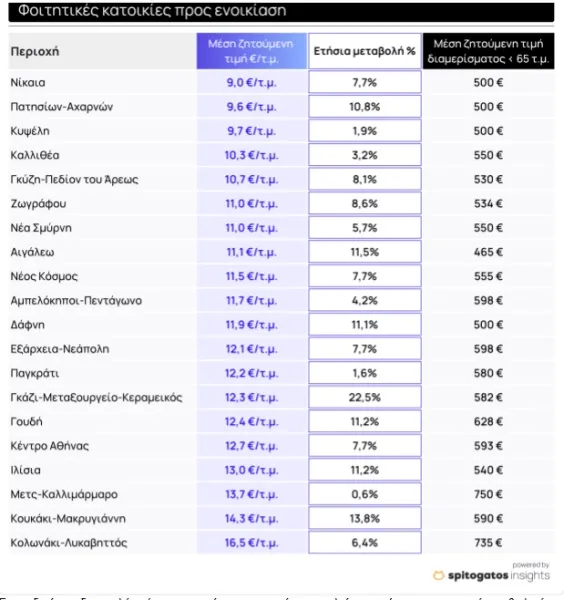 Για όσους αναζητούν φοιτητική κατοικία κοντά στην Πανεπιστημιούπολη ή την Πολυτεχνειούπολη, ενδεικτικά μπορούν να αναζητήσουν στούντιο με ΜΖΤ ενοικίασης 455€ στην περιοχή του Ζωγράφου ενώ ένα στούντιο στα Ιλίσια έχει ΜΖΤ ενοικίασης 480€. Επιπρόσθετα ένα στούντιο στο κέντρο του Πειραιά που μπορεί να εξυπηρετήσει έναν φοιτητή του Πανεπιστημίου Πειραιά, έχει ΜΖΤ ενοικίασης 450€ ενώ στην Καλλιθέα η ΜΖΤ ενοικίασης ανέρχεται και πάλι στα 450€ όπως φαίνεται και στον παρακάτω πίνακα.