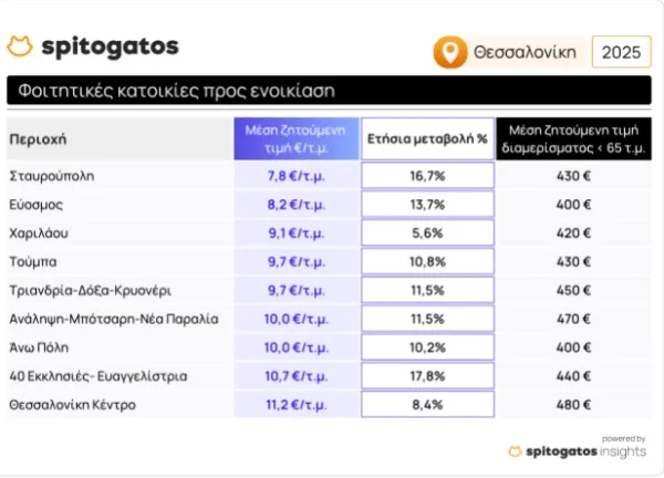 Σημαντική αύξηση της τάξης του 10,9% σημείωσε η ΜΖΤ ενοικίασης φοιτητικών κατοικιών στην Θεσσαλονίκη το 2ο τρίμηνο του 2025 σε σχέση με την ίδια περίοδο την προηγούμενη χρονιά. H χαμηλότερη μέση ζητούμενη τιμή ενοικίασης φοιτητικής κατοικίας στη Θεσσαλονίκη εντοπίζεται στην περιοχή της Σταυρούπολης και του Ευόσμου ενώ οι υψηλότερες μέσες ζητούμενες τιμές ενοικίασης φοιτητικής κατοικίας εντοπίζονται στην περιοχή 40 Εκκλησιές- Ευαγγελίστρια και στο κέντρο της Θεσσαλονίκης.