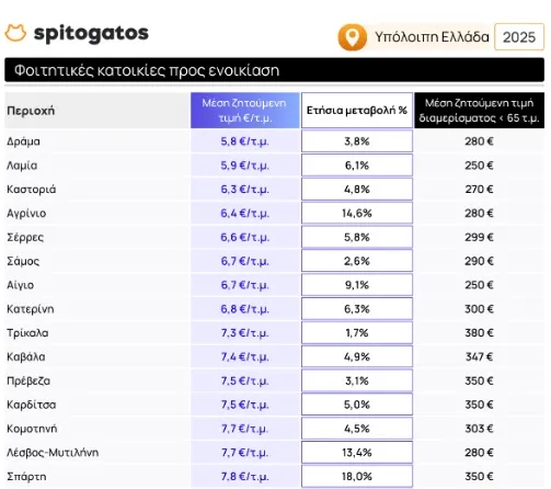 Αυξήσεις στη μέση ζητούμενη τιμή ενοικίασης φοιτητικής κατοικίας σημειώνονται στις περισσότερες φοιτητουπόλεις της Ελλάδας κατά το 2ο τρίμηνο του 2025 σε σχέση με το 2ο τρίμηνο του 2024. Πιο προσιτές ΜΖΤ ενοικίασης φοιτητικής κατοικίας εντοπίζονται στη Δράμα, στη Λαμία και την Καστοριά ενώ οι υψηλότερες σημειώνονται σε σημεία τα οποία έχουν έντονη τουριστική δραστηριότητα τους θερινούς μήνες όπως τα Χανιά, η Κέρκυρα και το Ρέθυμνο. Μεγάλες αυξήσεις στη ΜΖΤ ενοικίασης φοιτητικής κατοικίας σημειώθηκαν σε Φλώρινα, Σπάρτη και Χανιά κατά το 2ο τρίμηνο του 2025 σε σχέση με την ίδια περίοδο το 2024.