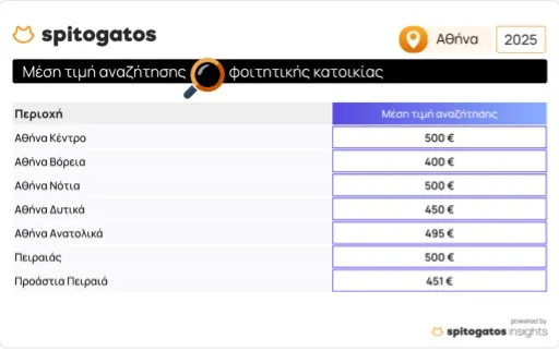 Την ίδια στιγμή που οι ζητούμενες τιμές φοιτητικών κατοικιών παρουσιάζουν αυξήσεις σε όλη τη χώρα, ενδιαφέροντα είναι τα στοιχεία αναζήτησης από πλευράς των υποψήφιων ενοικιαστών. Πιο συγκεκριμένα, οι γονείς ή οι μελλοντικοί φοιτητές αναζητούν φοιτητικό σπίτι με μέση τιμή που ανέρχεται στα 500 ευρώ στον κεντρικό τομέα της Αθήναςκαι στα Νότια Προάστια, στα 400€ στα Βόρεια και στα 450€ στα Δυτικά Προάστια.