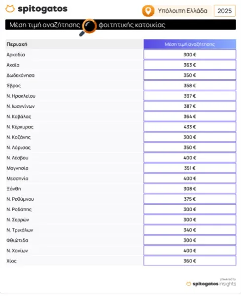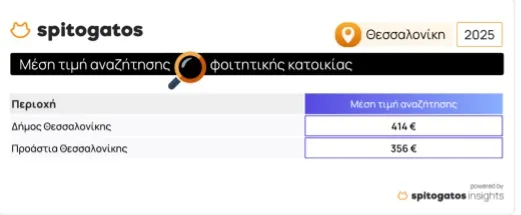 Στον Δήμο Θεσσαλονίκης, η μέση τιμή αναζήτησης φοιτητικής κατοικίας ανέρχεται στα 414€ ενώ στα Προάστια της Θεσσαλονίκης η αντίστοιχη τιμή είναι 356€. Σε ό,τι αφορά την αναζήτηση φοιτητικής κατοικίας στην υπόλοιπη Ελλάδα, παρατηρείται ότι η μέση τιμή αναζήτησης ωθείται προς τα πάνω σε περιοχές που έχουν έντονη τουριστική δραστηριότητα τους θερινούς μήνες όπως τα Χανιά, η Κέρκυρα, η Λέσβος και η Μεσσηνία όπως φαίνεται και στον παρακάτω πίνακα.