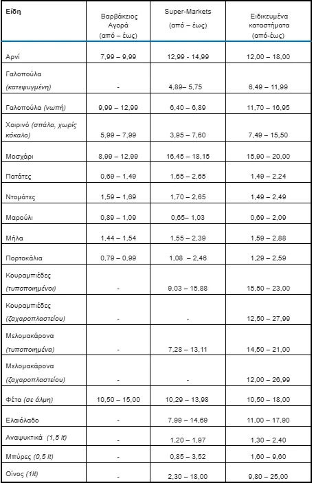Σύμφωνα με το ΙΝ.ΕΜ.Υ.-ΕΣΕΕ, το εύρος των τιμών οφείλεται στην καταγραφή προϊόντων διαφορετικής ποιότητας, από διάφορες τοπικές αγορές και διαφορετικούς τύπους καταστημάτων. Συγκεκριμένα, συλλέχθηκαν τιμές τόσο από αλυσίδες σούπερ μάρκετ όσο και από εξειδικευμένα καταστήματα λιανικής, όπως ζαχαροπλαστεία και κρεοπωλεία, καθώς και από τη Βαρβάκειο αγορά. Επισημαίνεται ότι οι τιμές που παρουσιάζονται στους σχετικούς πίνακες είναι ενδεικτικές και αποσκοπούν στην αποτύπωση της γενικής εικόνας και της διάρθρωσης των τιμών στην αγορά.