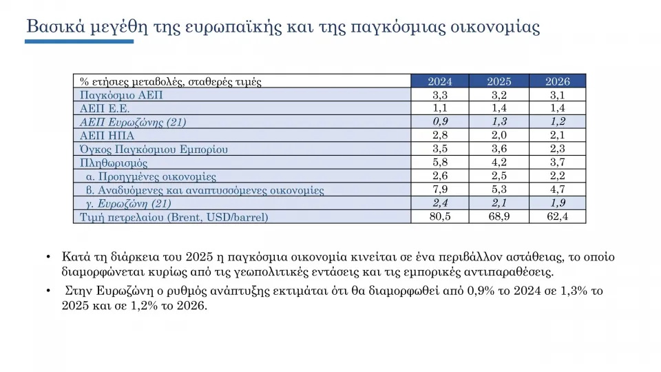 Παρά την αβεβαιότητα στο παγκόσμιο οικονομικό περιβάλλον, η ελληνική οικονομία προβλέπεται να συνεχίσει για έκτο συναπτό έτος να καταγράφει σημαντικά υψηλότερο ρυθμό πραγματικής ανάπτυξης σε σχέση με τον μέσο όρο της Ευρωζώνης. Ο ρυθμός ανάπτυξης αναμένεται να ανέλθει σε 2,2% το 2025 και 2,4% το 2026, έναντι 1,3% και 1,2% για την Ευρωζώνη αντίστοιχα. Το ονομαστικό ΑΕΠ αναμένεται να αυξηθεί από τα 248,7 δισ. ευρώ το 2025 σε 260 δισ. ευρώ το 2026. Παράλληλα, ο εγχώριος πληθωρισμός αναμένεται να αποκλιμακωθεί από 2,6% το 2025 σε 2,2% το 2026.