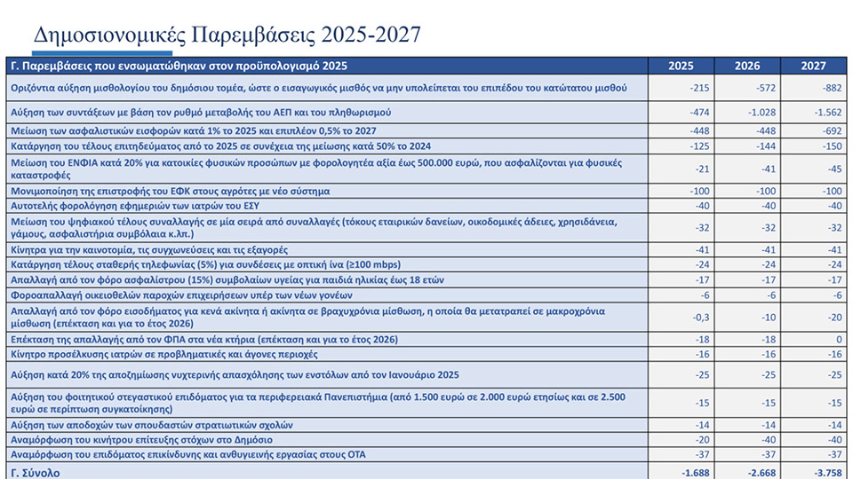 Παράλληλα, η μείωση των φορολογικών συντελεστών συνεπάγεται μεγαλύτερη ωφέλεια για τους εργαζόμενους, τους συνταξιούχους, τους αγρότες και τους ελεύθερους επαγγελματίες με κάθε μελλοντική αύξηση των αποδοχών τους. Στο πλαίσιο της δημογραφικής φορολογικής μεταρρύθμισης εισάγονται επιπλέον μέτρα με τοπικά χαρακτηριστικά και παρεμβάσεις που σχετίζονται με το στεγαστικό πρόβλημα, όπως η σταδιακή κατάργηση του ΕΝΦΙΑ για οικισμούς με πληθυσμό έως 1.500 κατοίκους, η μείωση του ΦΠΑ στα ακριτικά νησιά με πληθυσμό έως 20.000 κατοίκους, η μείωση της φορολογίας ενοικίων σε συνδυασμό με την επιστροφή ενός ενοικίου ετησίως καθώς και η μείωση των τεκμηρίων διαβίωσης για τις κατοικίες και άλλα περιουσιακά στοιχεία με απαλλαγή των εξαρτώμενων τέκνων από την ελάχιστη δαπάνη διαβίωσης. Επιπροσθέτως, ενισχύεται το εισόδημα των συνταξιούχων μέσω της σταδιακής κατάργησης του συμψηφισμού των αυξήσεων των συντάξεων με την προσωπική διαφορά, με την περαιτέρω αύξηση των συντάξεων βάσει ΑΕΠ και πληθωρισμού καθώς και με την ενίσχυση των χαμηλοσυνταξιούχων, των ανασφάλιστων υπερηλίκων και των ατόμων με αναπηρία κάθε Νοέμβριο.