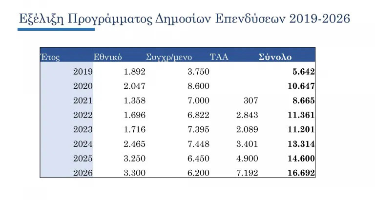 Ο ρυθμός μεταβολής των επενδύσεων αναμένεται να αυξηθεί από 4,5% το 2024 σε 5,7% το 2025 και σε 10,2% το 2026, καθ’ όσον σε συνδυασμό με τη δυναμική που επιδεικνύουν οι ιδιωτικές επενδύσεις, αναμένεται να υλοποιηθεί ένα σημαντικά διευρυμένο πρόγραμμα δημοσίων επενδύσεων το 2026, με πόρους ύψους 16,7 δισ. ευρώ έναντι 14,6 δισ. ευρώ το 2025. Η ανωτέρω αύξηση των επενδύσεων είναι πολλαπλάσια αυτής του μέσου όρου της Ευρωζώνης που εκτιμάται σε 2,2% για το 2025 και 2,5% για το 2026, μειώνοντας περαιτέρω το παραγωγικό κενό. Σε αυτά τα πλαίσια ο λόγος επενδύσεων προς ΑΕΠ αναμένεται να αυξηθεί από το 16,4% το 2025 σε 17,7% το 2026.