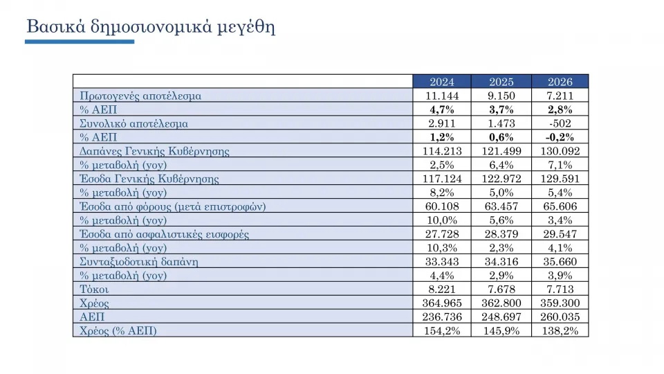 Το πρωτογενές αποτέλεσμα του κρατικού προϋπολογισμού αναμένεται να διαμορφωθεί σε 3,7% του ΑΕΠ για το 2025 και σε 2,8% το 2026, ενώ το συνολικό αποτέλεσμα της Γενικής Κυβέρνησης σε 0,6% το 2025 και σε -0,2% το 2026. Σε αυτό το πλαίσιο, το χρέος της Γενικής Κυβέρνησης ως ποσοστό του ΑΕΠ αναμένεται να παρουσιάσει για έκτο συνεχόμενο έτος τη μεγαλύτερη αποκλιμάκωση στην Ευρωπαϊκή Ένωση και να διαμορφωθεί σε επίπεδα κάτω του 140%, με την πρόβλεψη να διαμορφώνεται σε 138,2%, που είναι το χαμηλότερο επίπεδο από το 2010.