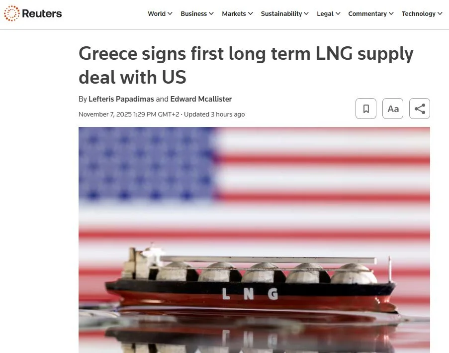 Σύμφωνα με το δημοσίευμα, η Ελλάδα υπέγραψε συμφωνία για την εισαγωγή 0,7 δισ. κυβικών μέτρων υγροποιημένου φυσικού αερίου (LNG) ετησίως από το 2030, σηματοδοτώντας την πρώτη μακροπρόθεσμη ενεργειακή συνεργασία της χώρας με τις ΗΠΑ.