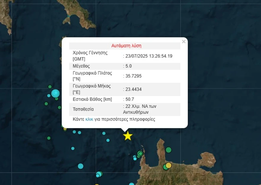 Σεισμός μεγέθους 5,2 Ρίχτερ σημειώθηκε το μεσημέρι της Τετάρτης, μεταξύ Κρήτης και Αντικυθήρων