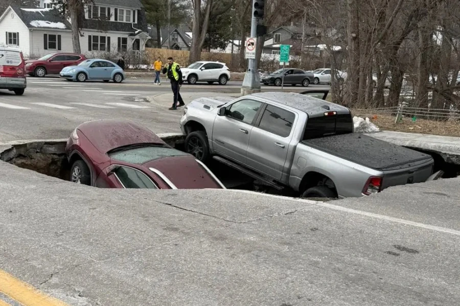 Όπως φαίνεται κι από τα πλάνα, ένα ασημί φορτηγάκι Dodge Ram και ένα καφέ SUV Jeep παγιδεύτηκαν στην καταβόθρα. Οι φωτογραφίες δείχνουν το μπροστινό μέρος των οχημάτων στραμμένο προς τα πάνω και προς το εξωτερικό της τρύπας.