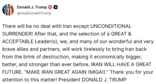 Σε ανάρτηση στο Truth Social, ο πρόεδρος των ΗΠΑ δήλωσε: «Δεν θα υπάρξει καμία συμφωνία με το Ιράν εκτός από ΑΝΕΥ ΟΡΩΝ ΠΑΡΑΔΟΣΗ».