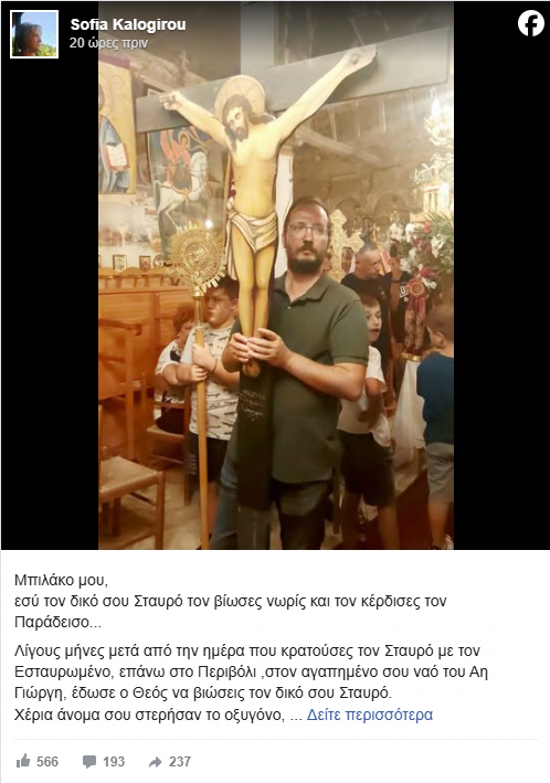 Λίγους μήνες μετά από την ημέρα που κρατούσες τον Σταυρό με τον Εσταυρωμένο, επάνω στο Περιβόλι, στον αγαπημένο σου ναό του Αη Γιώργη, έδωσε ο Θεός να βιώσεις τον δικό σου Σταυρό.